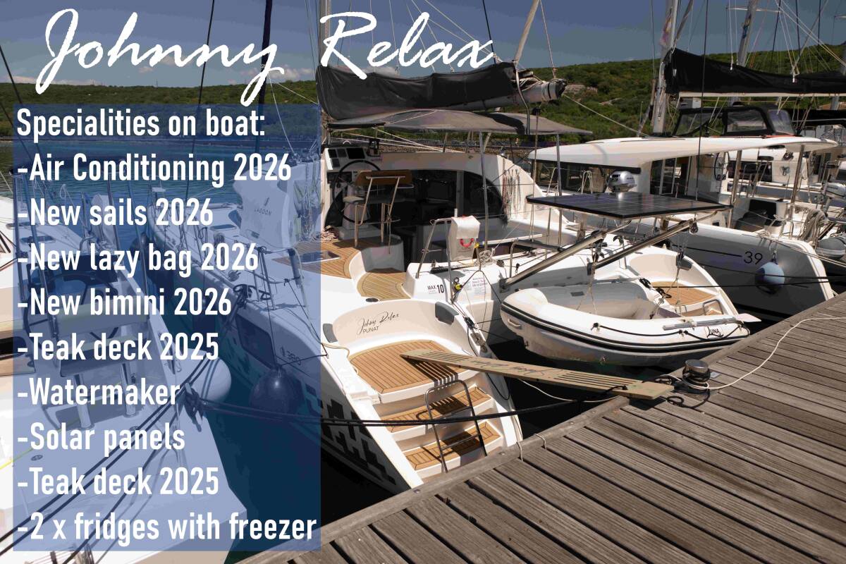 Katamarán Lagoon 380 S2 „Relax“, postaveno v roce 2007, je kotveno v Marina Punat, Krk - Chorvatsko. Jachta má 4 + 2 kajut, může ubytovat 8 + 2 osob a má 2 toalet/sprch.