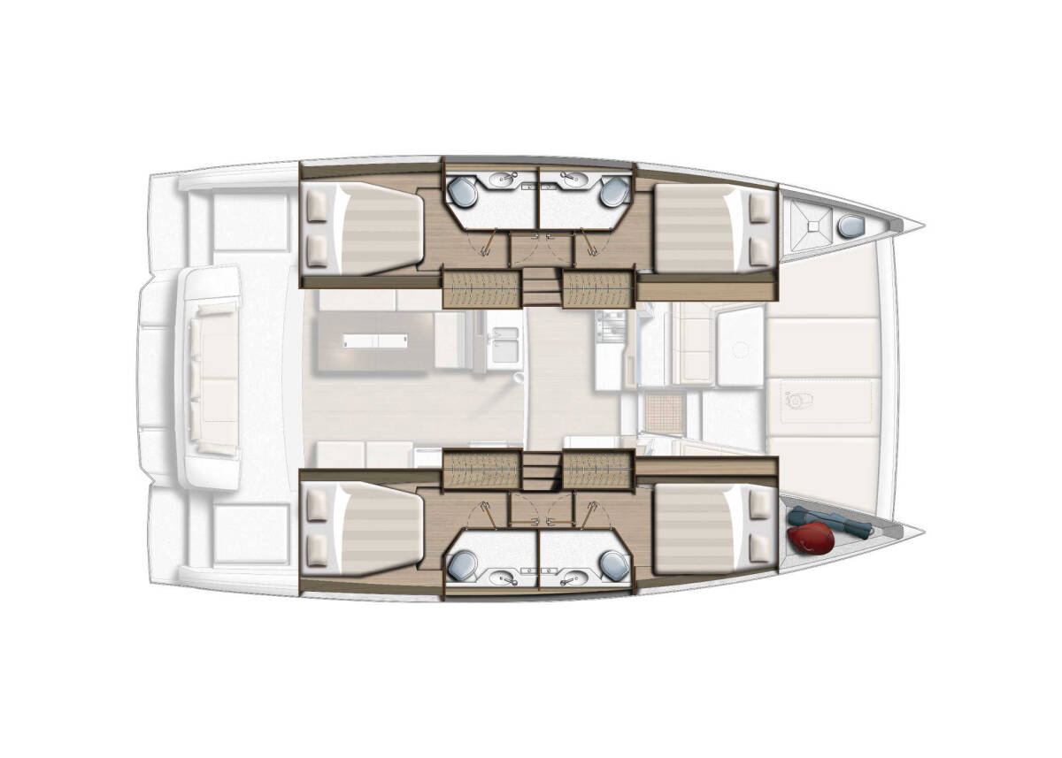 The Catamaran Bali 4.2 „Princess Evgenia“, built in 2025, is moored in Lefkas, Nikiana Marina - Greece. The yacht has 4 + 1 cabins, can accomodate 8 + 2 + 1 persons and has 4 toilets/showers.