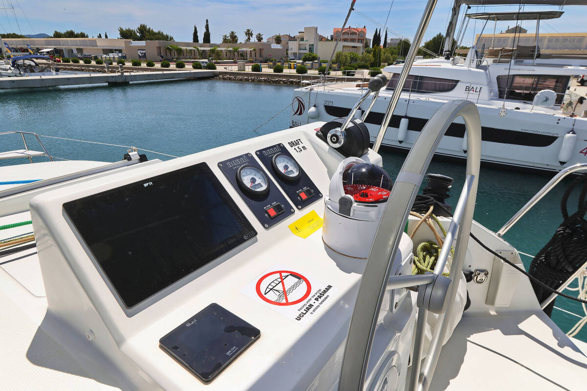 Bali Catspace „Esteri“ jest wyposażony w grot, fok i dodatkowo Daszek bimini, Autopilot, Ogrzewanie, Ploter map GPS - kokpit.