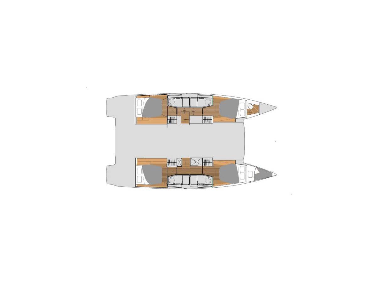 Katamaran Fountaine Pajot Elba 45 „Heidsieck“, rok produkcji 2026, jacht ten jest zacumowany w Olbia, Marina di Cugnana - Włochy. Jednostka posiada 4 + 1 kabiny, może pomieścić 8 + 2 + 1 persons i posiada 4 WC.