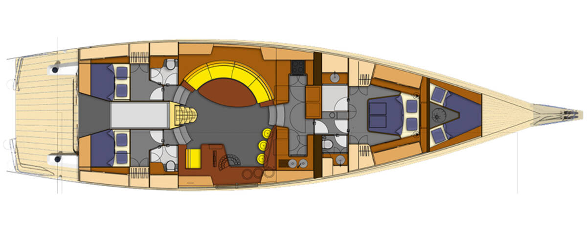 Garcia 72.2 „Makay“ jest wyposażony w grot, fok i dodatkowo Radar, Autopilot, Ogrzewanie, Tekowy kokpit.