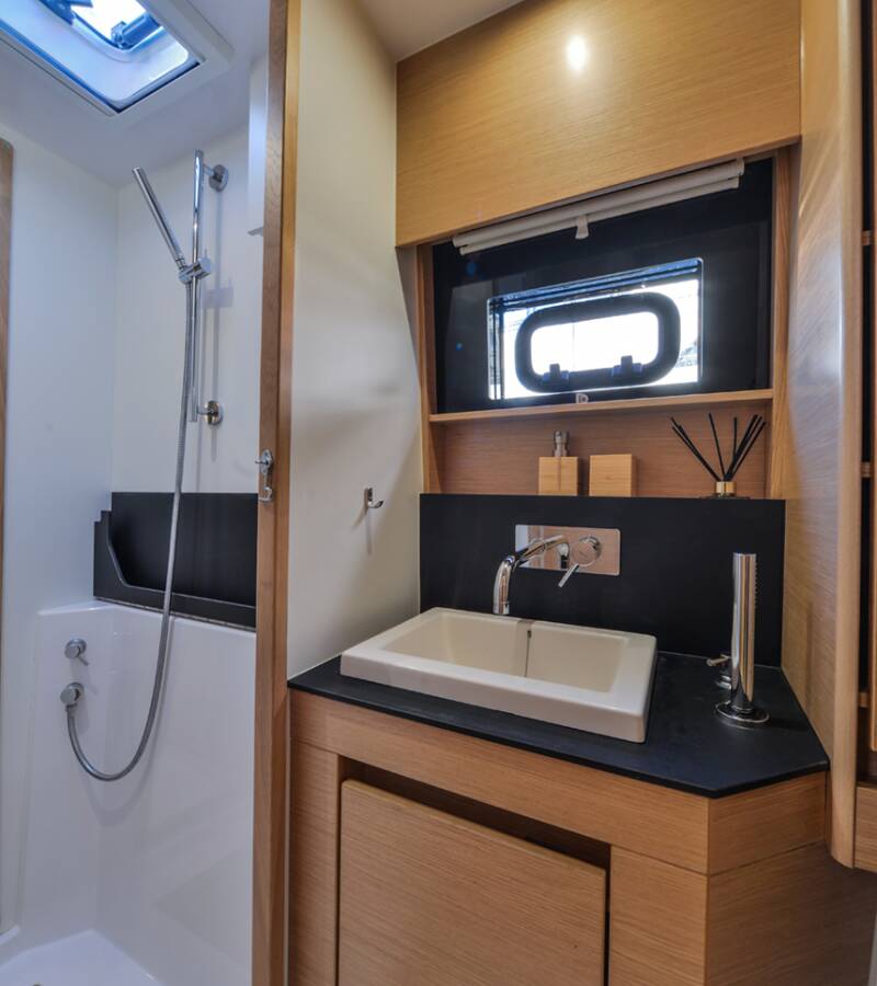 Nautitech 46 Fly „Odyssey“ oferuje niezwykły komfort dzięki m.in.: Poduszki w kokpicie, Toaleta elektryczna.