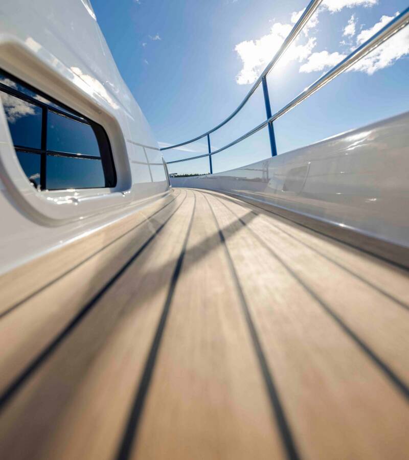Posiada niezwykły wygląd dzięki Pokład z drewna tekowego, Podwodne światła.
