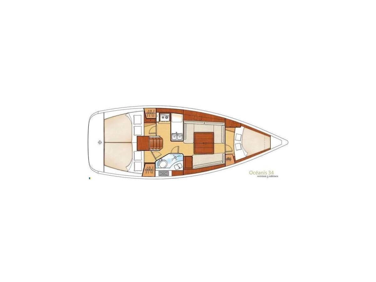 Oceanis 34 „Star Elisabeth “ jest wyposażony w grot, fok i dodatkowo Daszek bimini, Autopilot, Tekowy kokpit, Ploter map GPS - kokpit.