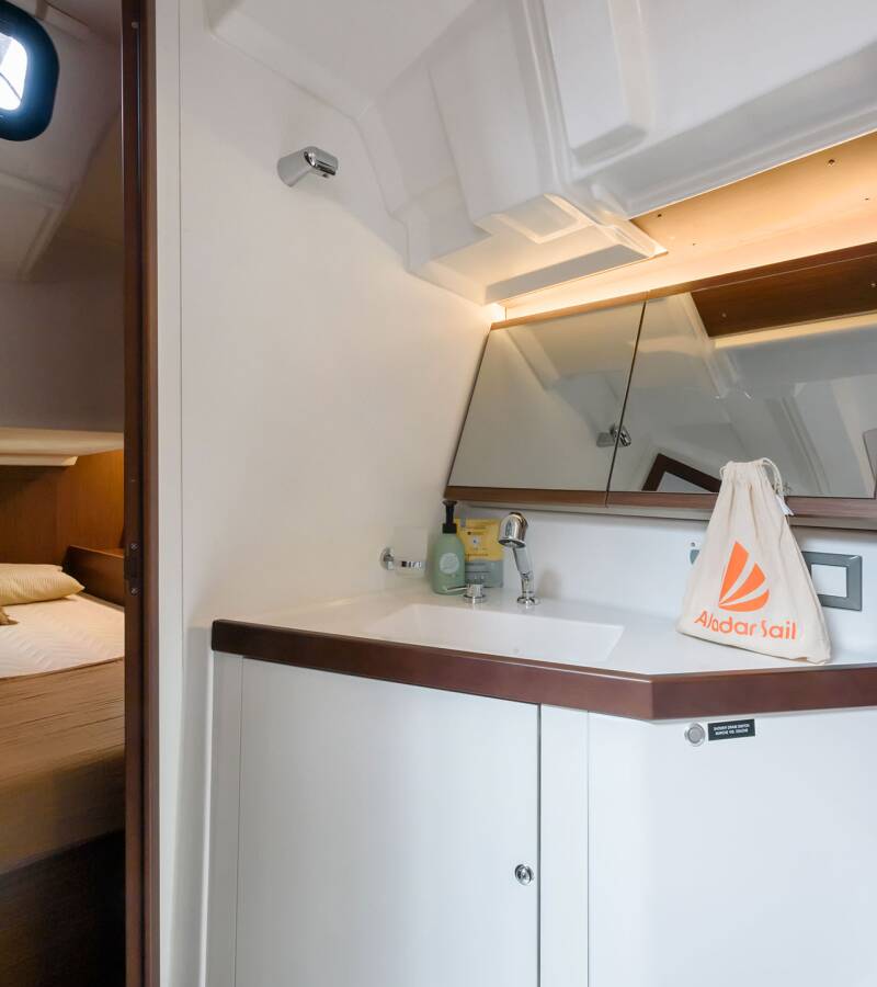 Oceanis 46.1 „Circe“ oferuje niezwykły komfort dzięki m.in.: Ster strumieniowy, Poduszki w kokpicie, Platforma kąpielowa, Inwerter, Toaleta elektryczna, Panele słoneczne.