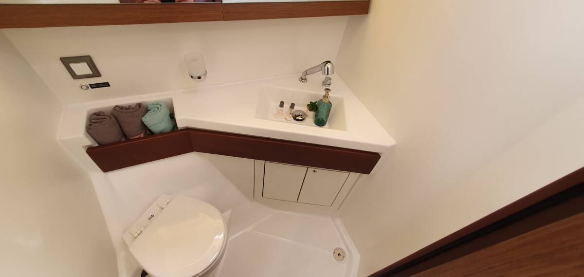 Oceanis 46.1 „Dommie“ oferuje niezwykły komfort dzięki m.in.: Ster strumieniowy, Klimatyzacja, Poduszki w kokpicie, Platforma kąpielowa, Toaleta elektryczna, Panele słoneczne.