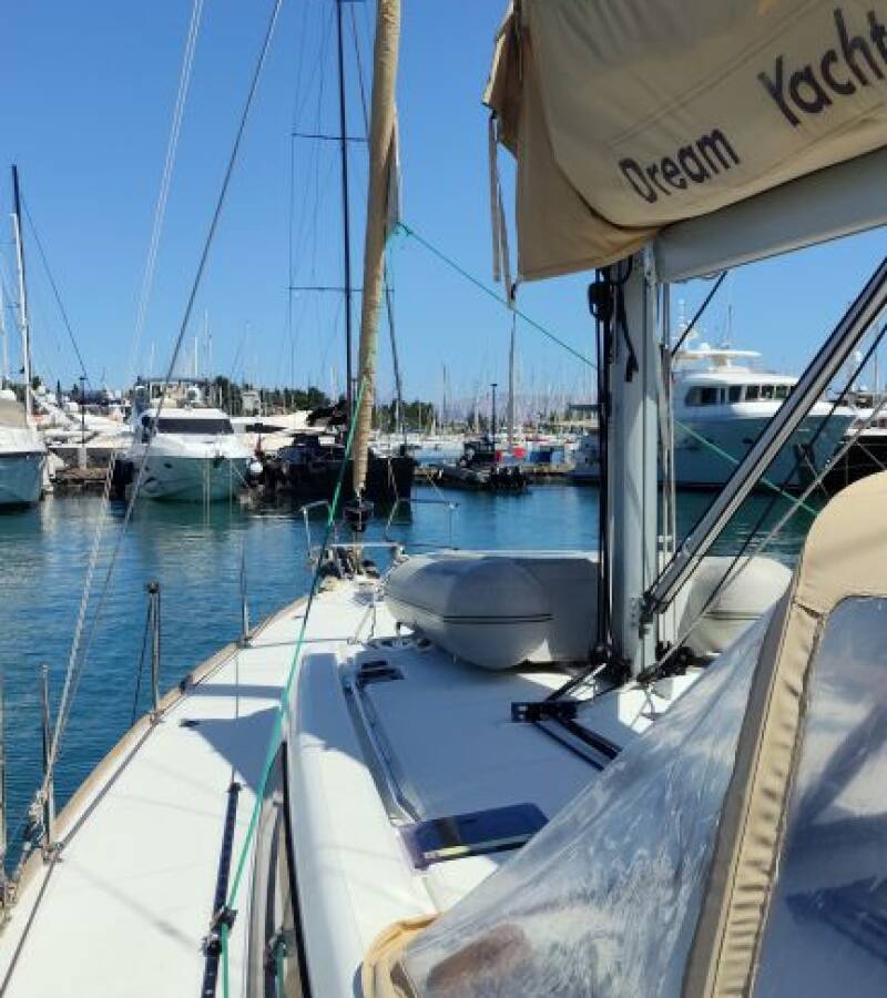 Oceanis 48 „ATLANTIS“ jest wyposażony w grot, fok i dodatkowo Daszek bimini, Autopilot, Szprycbuda.