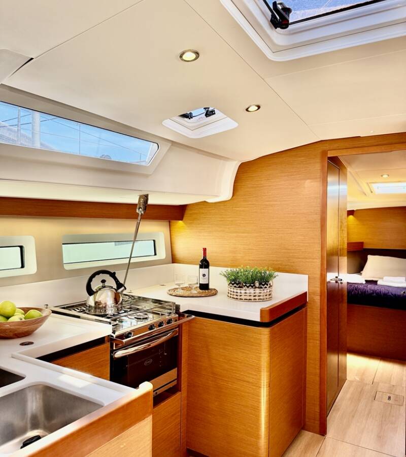Sun Odyssey 490 „Yada“ oferuje niezwykły komfort dzięki m.in.: Ster strumieniowy, Panele słoneczne.