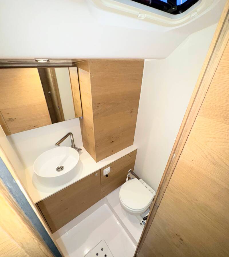 Elan Impression 45 „First“ je vybavená hlavným plachtou a genovou plachtou, ako aj Bimini, Autopilot, Sprayhood, Kúrenie, Tíkový kokpit, GPS mapový plotter - kokpit.