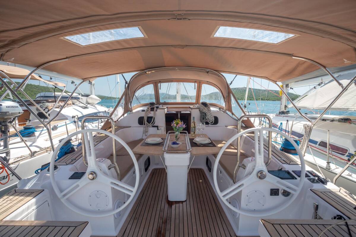 Elan Impression 45 „Jasmin“ je vybavená hlavným plachtou a genovou plachtou, ako aj Bimini, Autopilot, Sprayhood, Kúrenie, Tíkový kokpit, GPS mapový plotter - kokpit.