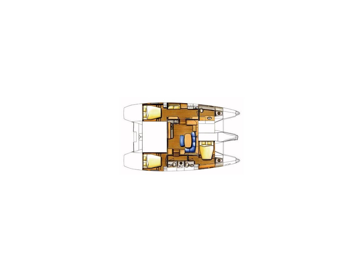 Lagoon 420 „Akala“ je vybavená hlavným plachtou a genovou plachtou, ako aj Bimini, Autopilot.